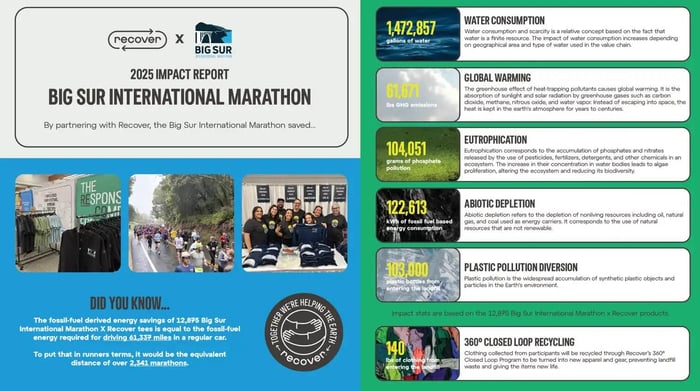 Big Sur International Marathon Event RecapBy partnering with Recover, events can offer high-quality, sustainable race apparel to participants and position their event as industry leaders in sustainability, driving meaningful environmental impact while fostering a more engaged, eco-conscious running community.