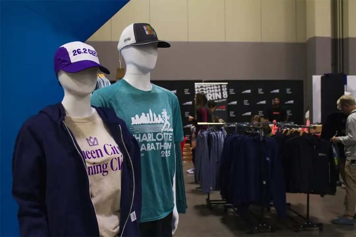 Charlotte Marathon ExpoOur print-on-demand program extends our low-waste apparel approach to online merchandise stores, offering custom sustainable apparel both pre-event (in-training gear, limited edition commemorative merchandise, etc.) and post-event (finisher Collection, etc.) for purchase online. By printing the apparel and shipping orders as they are placed, we eliminate excess inventory waste, guessing on sizes, and inventory management, which reduces environmental impact.